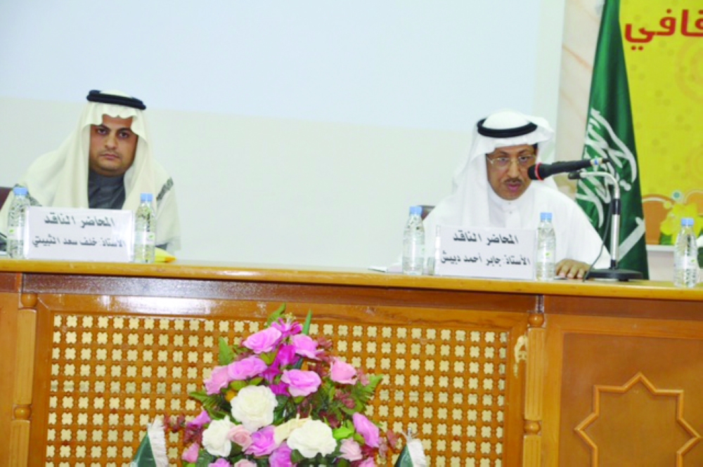 الزميل جابر دبيش وخلف الثبيتي في محاضرة نقدية أمس الأول بأدبي الطائف. (تصوير: عوض المالكي)