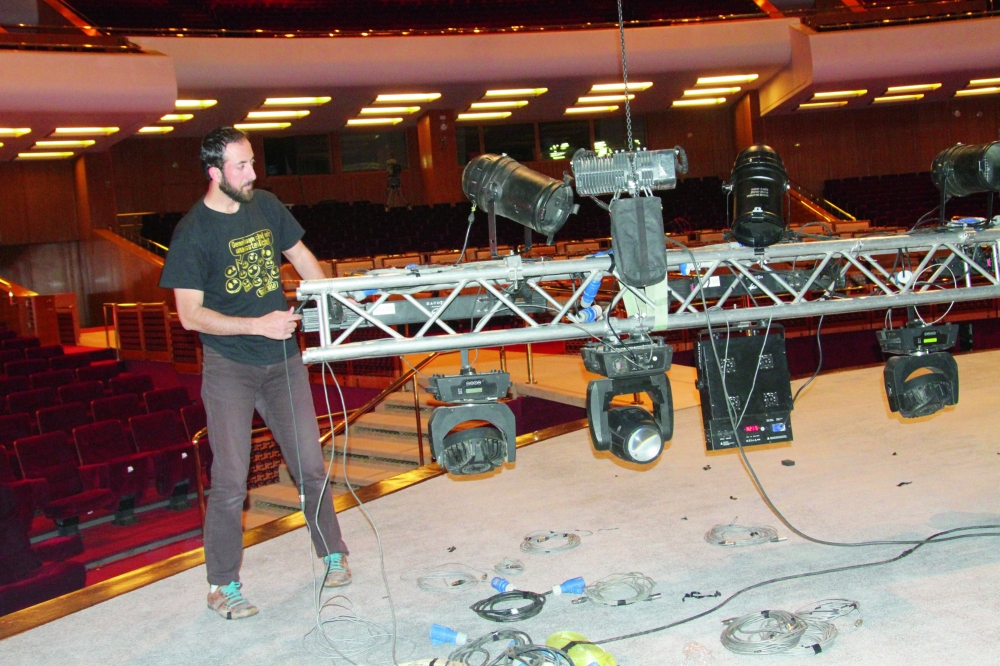 مهندس إضاءة يضع بصماته على مسرح الحفل أمس. (تصوير: عبدالعزيز اليوسف)