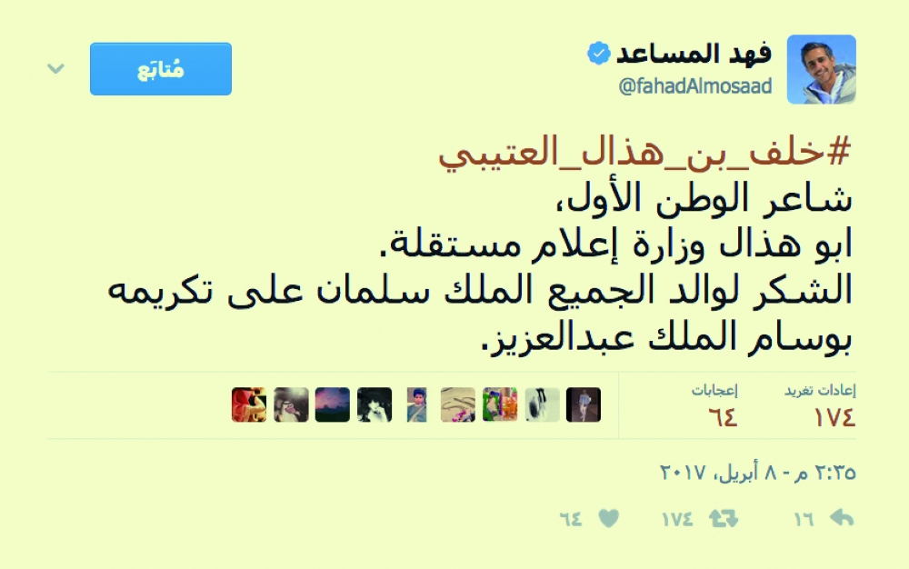وشدد الشاعر فهد المساعد على أن خلف شاعر الوطن الأول، بقوله: «أبو هذال وزارة إعلام مستقلة، الشكر لوالد الجميع الملك سلمان على تكريمه بوسام الملك عبدالعزيز».