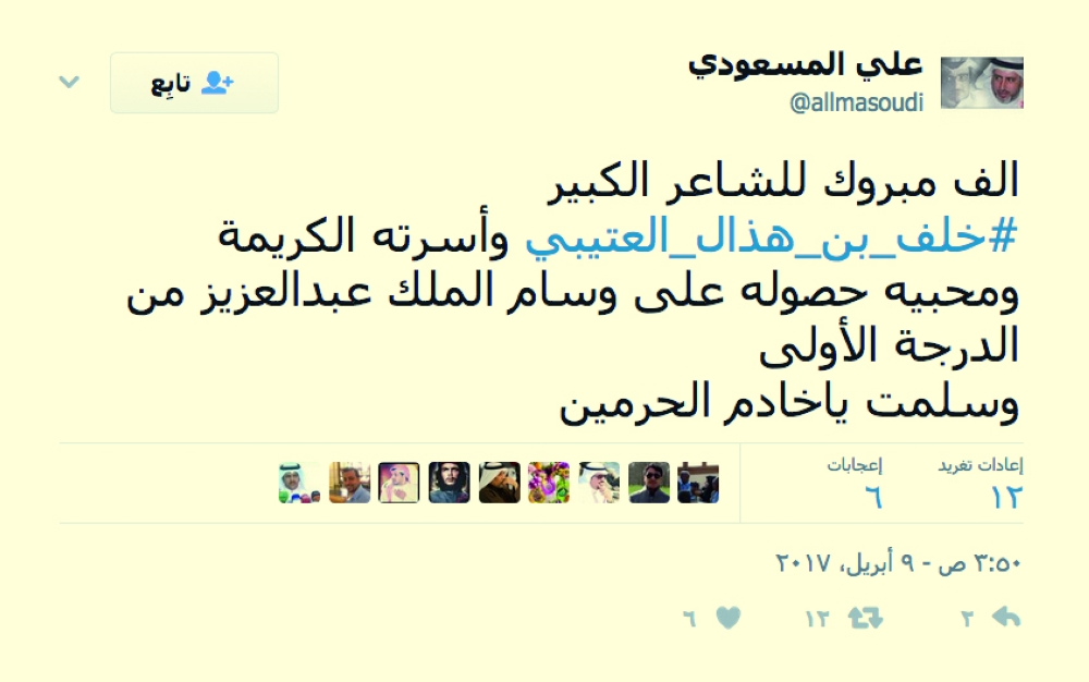 وكتب الإعلامي بتال القوس تغريدة عبر حسابه في «تويتر»: «خادم الحرمين يأمر بمنح خلف بن هذال العتيبي وسام الملك عبدالعزيز من الدرجة الأولى، يستاهل التكريم شاعر الوطن»، فيما قال الشاعر ياسر التويجري في تغريدة أخرى: «أبارك للشعر على منح شاعر الوطن الكبير خلف بن هذال وسام الملك عبدالعزيز من الدرجة الأولى، أبو هذال تاريخ حافل بالشعر والولاء»، وقال الإعلامي علي المسعودي: «ألف مبروك للشاعر الكبير خلف بن هذال العتيبي وأسرته ومحبيه حصوله على وسام الملك عبدالعزيز من الدرجة الأولى، وسلمت يا خادم الحرمين».
