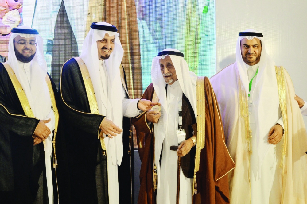 الأمير فيصل بن خالد يكرم شخصية العام الأدبية أحمد مطاعن في أبها أمس.