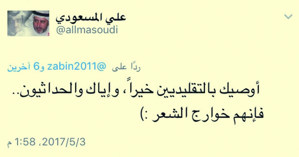 «عكاظ» تواصلت مع المسعودي لتفسير تغريدته، التي كتبها عن الحداثيين، وأوضح قائلا: «إذا عدنا إلى بدايات الحداثة والمبشرين بها نجد أن في مقدمتها الشاعرة العراقية الكبيرة نازك الملائكة التي كان لها السبق في تحديث القصيدة، ثم تبعها بدر شاكر السياب وانفرطت السبحة بعد ذلك، والملائكة في آخر دواوينها أوضحت ما معناه أن القصيدة الحرة إلى أفول، وسيأتي يوم وتنتهي، والحقيقة أن ما دعت إليه وبشرت به أثبتت فشله خارج الأغنية، والشعر الحديث كما يكتبه الشعراء المحدثون هو تدمير للقصيدة، إذ أجهز عليها وألغاها جماهيرياً، فأصبحت منعزلة، وشعراؤها يدورون في حلقة مفرغة ويسمعون لبعضهم».