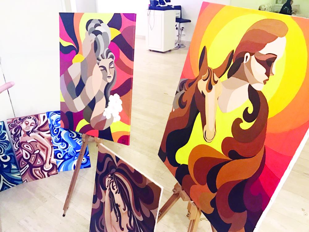 لوحات الفنانة التشكيلية الجوهرة المهنا في جلسات صالون أفق أمس الأول.