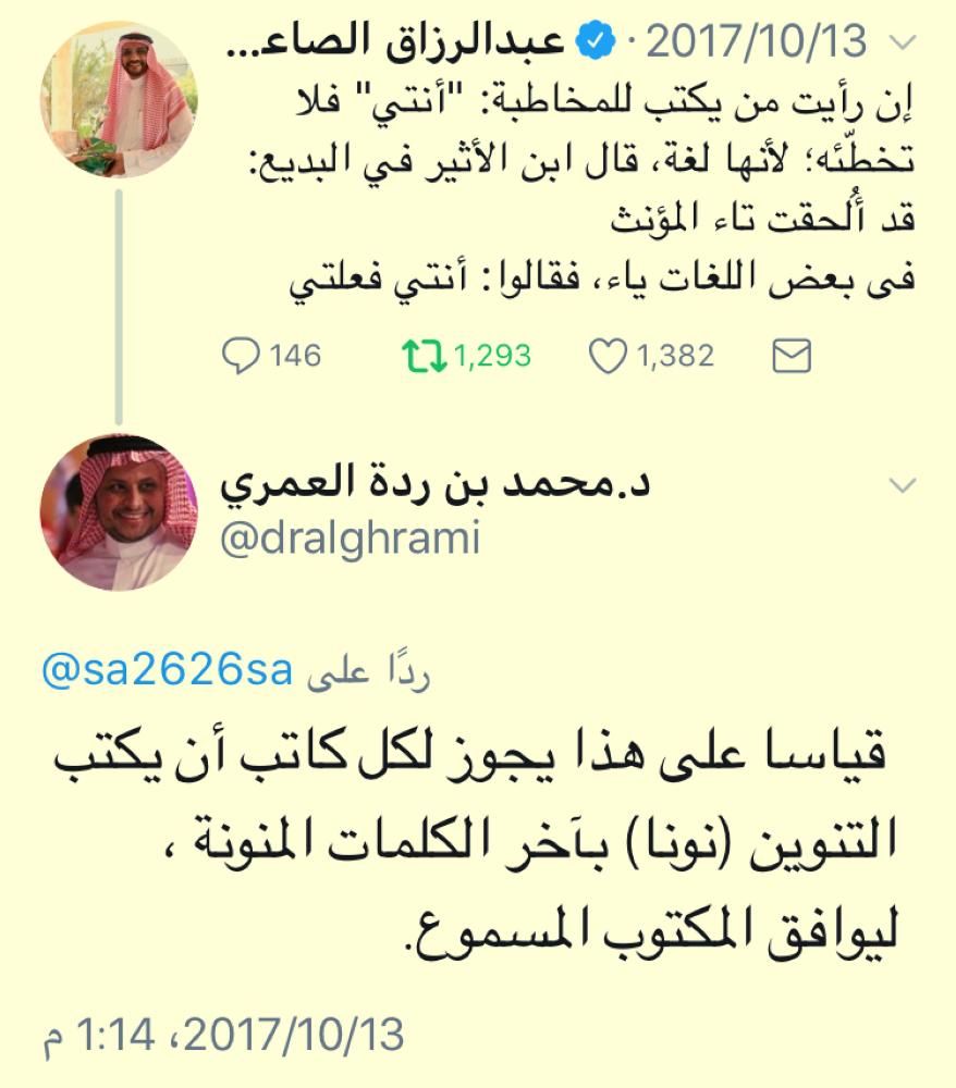 أثارت تغريدة للدكتور عبدالرزاق الصاعدي، حفيظة لغويين يميلون إلى اعتماد الرسم الإملائي المتفق عليه في الكتابة بعد أن قطع الصاعدي بصحة كتابة «أنتي» (بالياء) وأنه لا تصح تخطئة كاتبها قائلا: «إن رأيت من يكتب للمخاطبة«أنتي» فلا تخطّئه؛ لأنها لغة، قال ابن الأثير في البديع: قد أُلحقت تاء المؤنث في بعض اللغات ياء، فقالوا: «أنتي فعلتي»، مضيفا أن قياس ياء (أنتي) في الخط كقياس الألف في (أيها) الرجل.. والغرض التفريق بينها وبين المذكر (أنت)، ولذا أستحسن كتابتها بالياء، ولا أعده خطأ، مستشهداً بأنها لهجة قديمة وسائدة الآن في عامة لهجاتنا، لأن المطل في نحو (أنتِي) أسهل على اللسان من أنتِ.