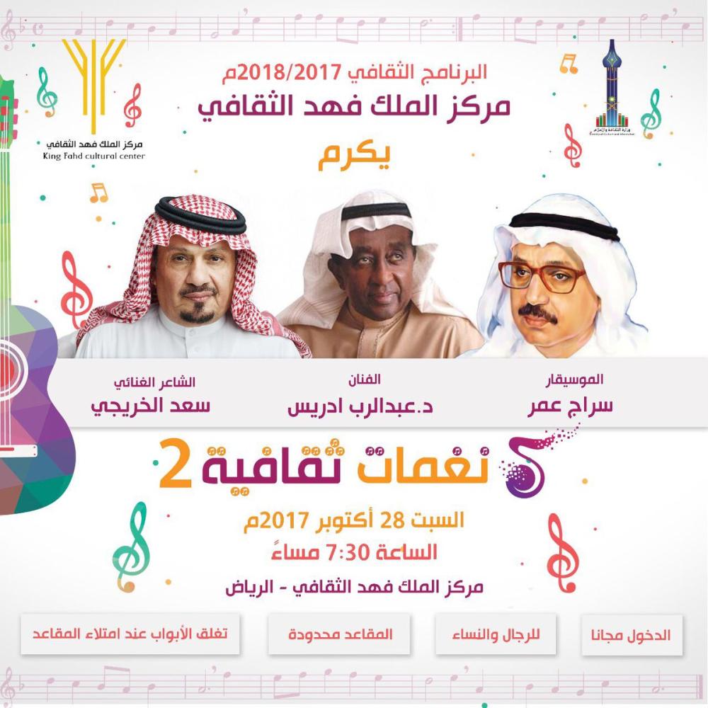 من جهة ثانية، يقدم المركز بعد غد (السبت) فعالية نغمات ثقافية 2، يتخللها تكريم الفنانين سراج عمر وعبدالرب إدريس وسعد الخريجي وبمشاركة الفنانين عبدالرحمن الشومر وإبراهيم السلطان وعماد إبراهيم.