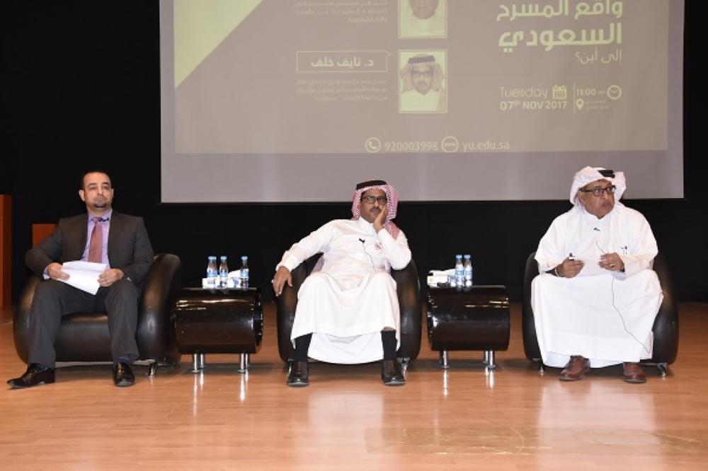 وناقشت الندوة واقع المسرح السعودي وطبيعة المراحل التي مر بها، فيما أشار الدكتور خالد خليفة إلى أن الحديث عن المسرح السعودي اليوم في هذه المرحلة يعتبر فريدا من نوعه في مجاله وموضوعه «الحديث يجمع بين جيلين في الفن المسرحي السعودي، يجمع بين الريادة والحداثة، الريادة الممثلة في الكاتب محمد العثيم، والحداثة المتمثلة في الدكتور نايف خلف».