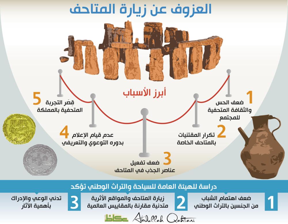 وفيما يؤكد أستاذ التاريخ الدكتور عبدالعزيز الغنيم أن المتاحف نفسها هي من أسباب العزوف لعدم اتباعها الوسائل الجذابة والمتقدمة في العرض، توضح الباحثة الدكتورة دليل مطلق القحطاني أن زيارة المتاحف والمواقع الأثرية في المجتمع لم تتحول إلى ثقافة عامة مترسخة في حياتهم ونشاطهم، بحيث تكون إحدى أولويات أجندتهم السياحية والترفيهية، في الوقت الذي تزخر به المملكة بباقة من المتاحف وآثار جملة من الحضارات.