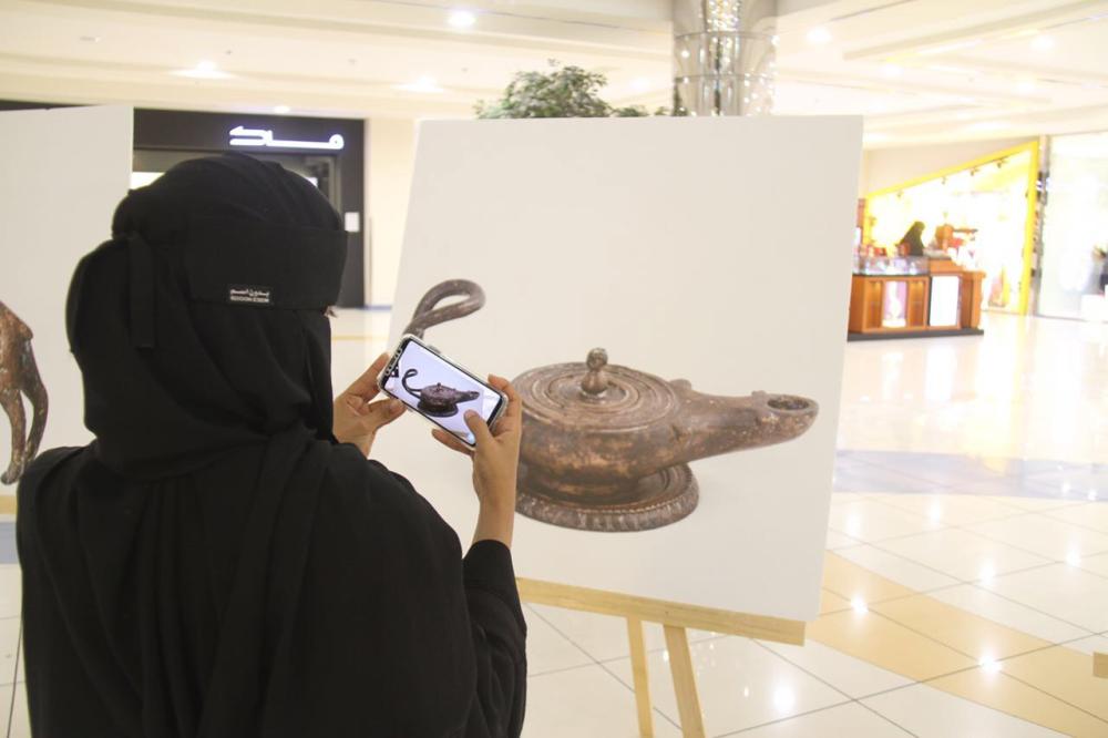 زائرة للمعرض التوعوي الثاني تلتقط صورة بالهاتف المحمول لأحد الآثار المعروضة في الحدث الذي نظمه فريق «آثاريون» التطوعي بالجمعية السعودية للدراسات الأثرية. وقال المدير التنفيذي للجمعية سعيد الأحمري لـ«عكاظ»: سعينا لتأصيل جسور المعرفة بين علماء الآثار والمجتمع وهوية الحضارات. أما المشرفة على فريق «آثاريون» مريم الحربي فأوضحت أن المعرض احتوى صورا للقطع الأثرية المستخرجة من مواقع الحضارات بالمملكة.