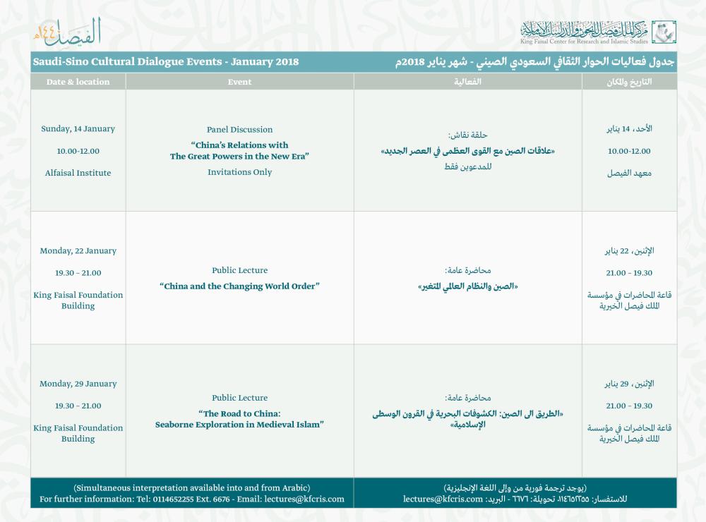 وهناك محاضرتان في قاعة المحاضرات بمبنى مؤسسة الملك فيصل الخيرية، الأولى: «الصين والنظام العالمي المتغير» (الإثنين 22 يناير)، بمشاركة وفد من جامعة تشينغهوا الصينية، والثانية «الطريق إلى الصين.. الكشوفات البحرية في القرون الوسطى الإسلامية» (يوم الإثنين 29 يناير).