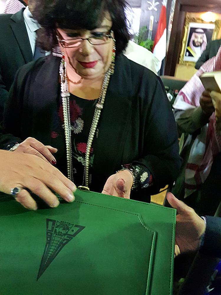 وزيرة الثقافة المصرية في زيارتها لجناح جامعة نايف. (عكاظ)