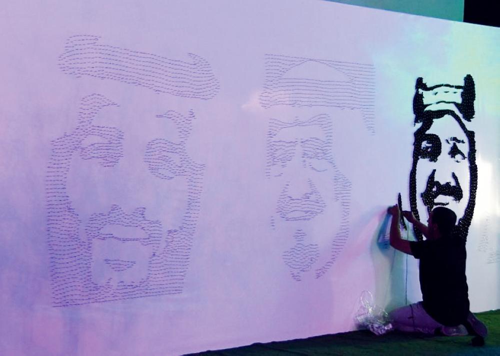 الفنان فلاح البقمي يبدع في رسم صورة المؤسس بالمسامير والصوف، ويلفت أنظار زوار الجنادرية 32.