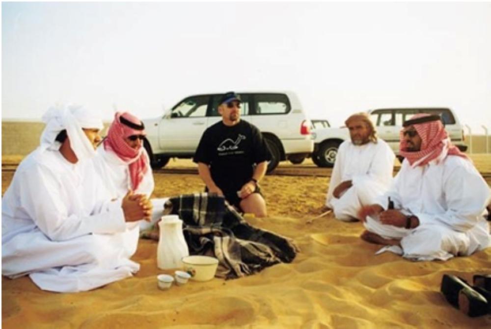 في نهاية المطاف وافق تنسون على العرض بعد أن رتب أوضاعه واقنع شريكه في العيادة البيطرية «دوغ كليور» بتأجير العيادة والسفر معه لقضاء فترة تجريبية مدتها 3 أشهر. وهكذا غادر بلاده للمرة الأولى في حياته على متن طائرة كمسافر في درجة رجال الأعمال، قاصدا أبوظبي. يقول حول أسباب قبوله العرض: «كان الراتب مغريا، وكانت أجور مدرسة الأطفال مدفوعة، وكان سيـُخصص لنا منزل، وكل ذلك بلا ضرائب».أما عن اللحظات الأولى لهبوطه على أرض أبوظبي فقد كتب: «لدى فتح باب الطائرة الخاص بدرجة رجال الأعمال جوبهنا بموجة من هواء الخليج العربي الحار الممزوج برائحتي وقود الطائرات والقار. وكان في استقبالنا في الساعات الأولى من ذلك النهار عبدالله البادي (صديق هيث هارس) ومقرر مستقبلنا. كان عبدالله يرتدي ثوبا أبيض ويرافقه مسؤول أمني يرتدي بدلة زرقاء ويحمل رشاشا. رافقانا لدى نزولنا سلم الطائرة وأدخلانا إلى قاعة الشخصيات المهمة». ويضيف ما مفاده أن أمتعته سبقته إلى الفندق مع سائق خاص وضع تحت تصرفه، كما أن البادي - في التفاتة لطيفة - ناوله هاتفه المحمول ليتصل بزوجته ويطمئنها على سلامة وصوله. تفاجأ تنسون بكل هذا، لكنه عرف أن الأمور تجري هكذا حينما يكون المسافر قادماً للعمل لدى الشيوخ، ثم تفاجأ أكثر حينما اصطحبوه في اليوم التالي لتناول الغداء في فيلا فخمة. دعونا نقرأ ما كتبه حول ذلك: «جلسنا أمام مائدة مغطاة بأنفس وجبات الشرق الأوسط، إضافة إلى الأطباق المحلية المميزة، كالماعز المشوي المرقد على فرشة أرز مزينة بحبات الزبيب ولب الصنوبر».