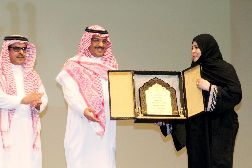 المداح خلال تسلمها تكريم الشاعرة ثريا قابل من د. الحجيلان. (تصوير: عبدالعزيز اليوسف)