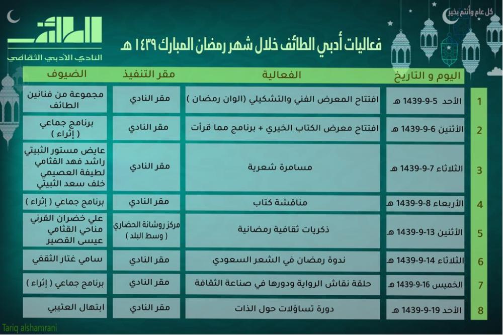 وبين رئيس النادي بالطائف عطا الله بن مسفر الجعيد، أن الفعاليات الثقافية تتضمن معرضا تشكيليا، يضم العديد من الألوان الرمضانية التي يقيمها النادي، خلال شهر رمضان المبارك بحضور عدد من مثقفي ومبدعي الطائف بمشاركة أكثر من 20 فنان وفنانة من جماعة فرقد الإبداعية بالنادي. وقدم التشكيلي ماجد الراسم رئيس جماعة فرقد التشكيلية، شرحا عن الأعمال المعروضة اتسمت بتعدد مدارسها الفنية كالسوريالية والواقعية والتجريدية والتكعيبية والتجريبية.
