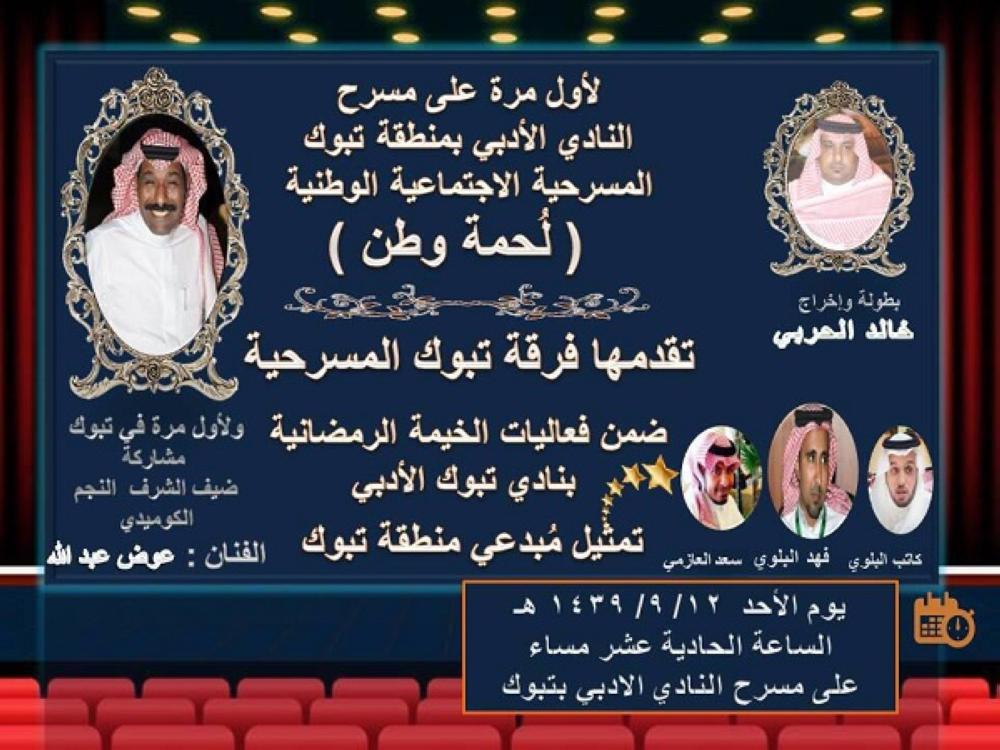 تُقام يوم غدٍ (الأحد) في نادي تبوك الأدبي مسرحية بعنوان «لُحمة وطن»، ضمن فعاليات خيمة تبوك الرمضانية، وذلك عند الساعة الحادية عشر مساء بمقر النادي.