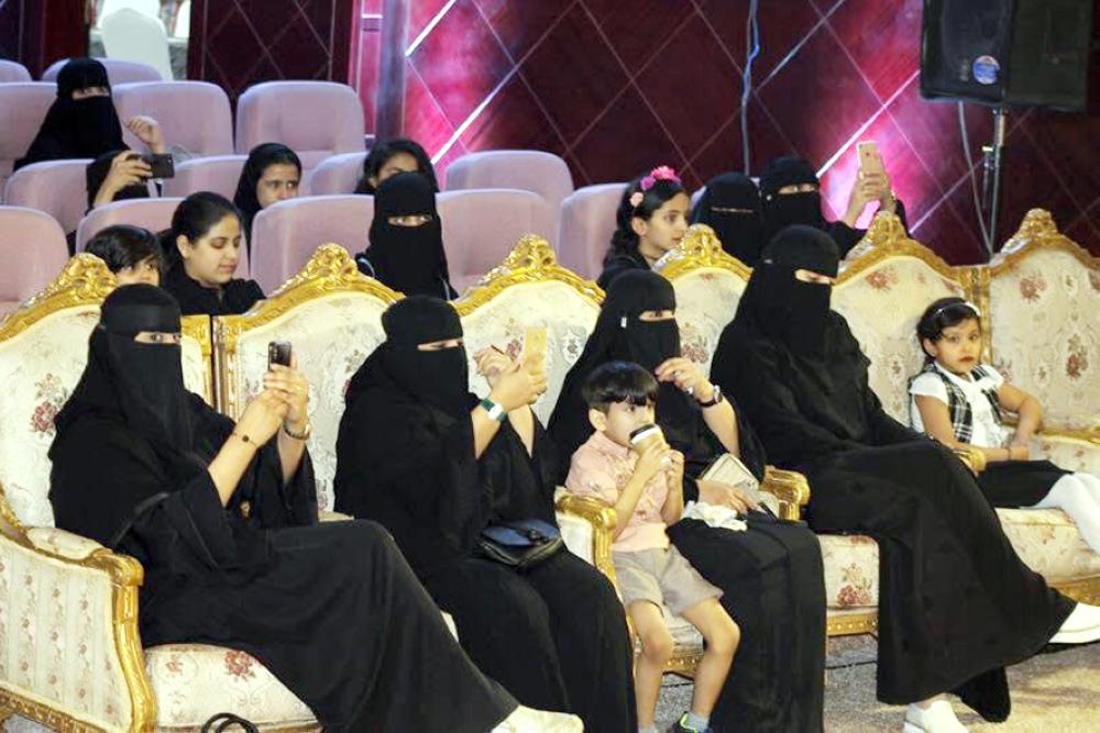 سيدات في أدبي تبوك يوثقن بعض مشاهد مسرحية «لحمة وطن» بهواتفهن. (عكاظ)