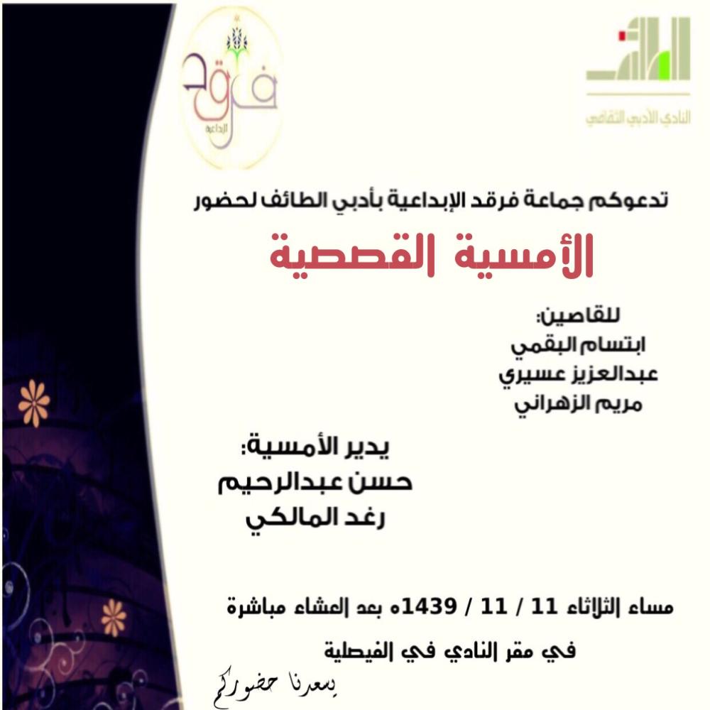 ينظم النادي الأدبي الثقافي بالطائف مساء الثلاثاء القادم أمسية قصصية ضمن أنشطة جماعة فرقد الإبداعية، يشارك فيها القاص عبدالعزيز عسيري، والقاصة ابتسام البقمي، والقاصة مريم الزهراني.