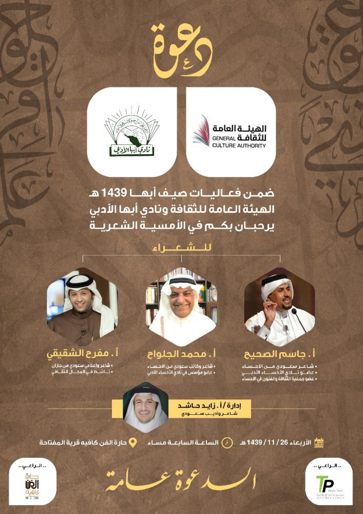 ضمن فعاليات مهرجان صيف أبها 39 يجمعنا، ينظم كل من هيئة الثقافة ونادي أبها الأدبي أمسية شعرية يشارك فيها الشعراء جاسم الصحيح ومحمد الجلواح ومفرح الشقيقي.