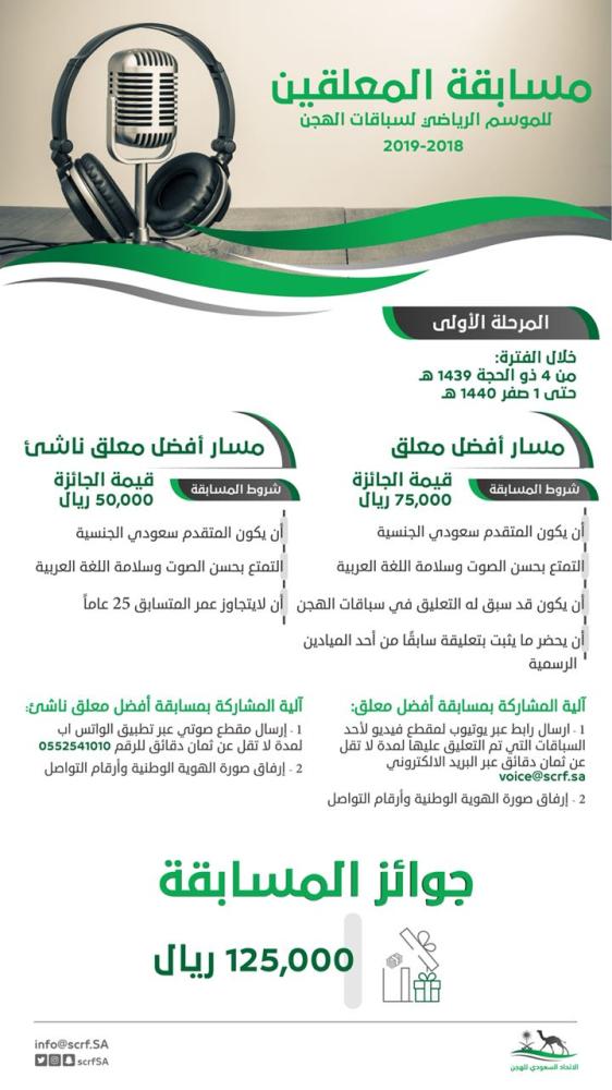 ويمكن للراغبين في الاشتراك بمسابقة أفضل معلق، التسجيل عبر إرسال رابط يوتيوب لمقطع فيديو لأحد السباقات التي تم التعليق عليها لمدة لا تقل عن ثمان دقائق إلى البريد الإلكتروني voice@scrf.sa، فيما يحتاج الراغبين بالتسجيل في مسابقة أفضل معلق ناشئ إرسال مقطع صوتي عبر تطبيق «واتس اب» لمدة لا تقل عن ثمان دقائق للرقم (0552541010)، مع ضرورة إرفاق صورة الهوية الوطنية وأرقام التواصل للراغبين بالتسجيل في أي من المسارين.