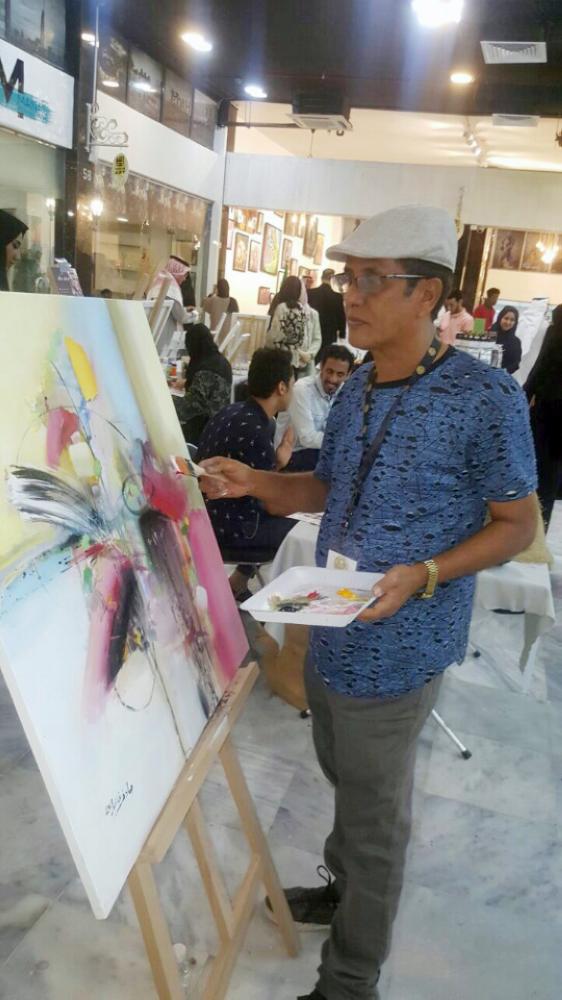 الفنان صادق غالب في ورشة عمل بمركز أدهم للفنون بجدة. (عكاظ)