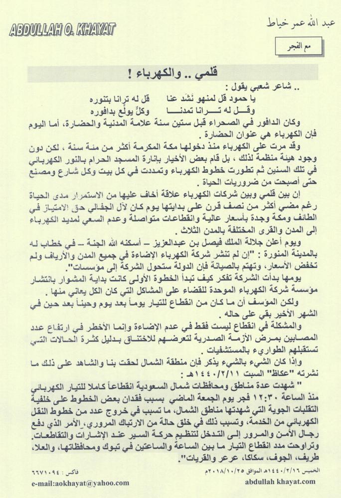 ولم ينقطع عبدالله خياط عن كتابة المقالات حتى وهو يلازم السرير الأبيض، إذ كتب عن كثير من المواقف والقضايا، ولم يثنه المرض يوما ما عن معشوقته «عكاظ»، ومصافحة القراء مطلع كل صباح بعموده الرشيق (مع الفجر)، الذي توارى بعد ستة عقود كان خلالها يضيء للقارئ الطريق في العديد من القضايا. الخياط، رحمه الله، كان أنيقا في تعاملاته وإبداء ملاحظاته واستفساراته وكأنه ليس الأستاذ والمعلم الذي رحل مخلفا إرثا كبيرا من الحب كان قد زرعه بصدق طرحه وحسن نواياه وحبه لوطنه.