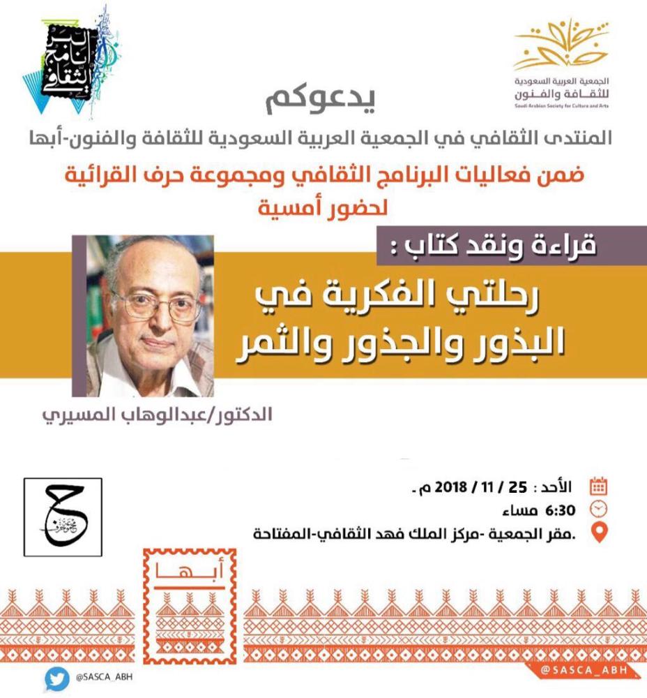 تناقش مجموعة حرف القرائية في جمعية الثقافة والفنون في أبها مساء غد (الأحد) في جلسة المجموعة الشهرية رحلة الدكتور عبدالوهاب المسيري من خلال كتابه «رحلتي الفكرية في البذور والجذور والثمر». حيث يقدم الورقة الرئيسية في الجلسة الكاتب يحيى العلكمي.