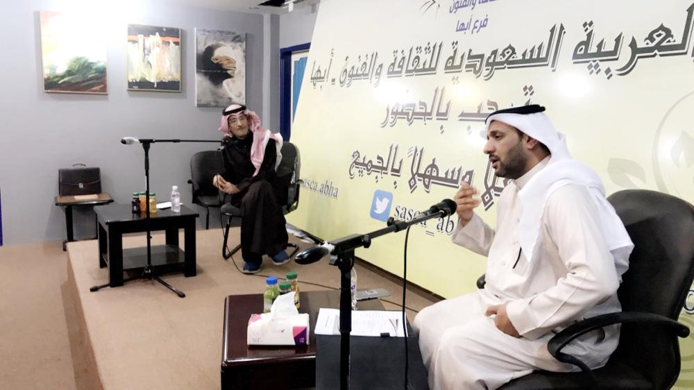 العلكمي متحدثاً في اللقاء، وإلى جواره مدير الأمسية فيصل الشعيب.
