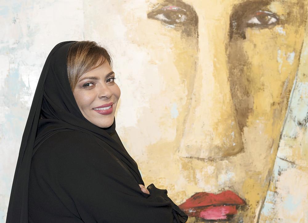الفنانة ريم الديني بجانب إحدى لوحاتها بالمعرض.
