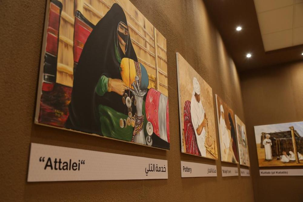 ويشتمل المعرض الذي يحاكي الزمن القديم وحرف الأجداد التي تم تناقلها عبر الأجيال، على لوحة لحرفة المعالجة الشعبية التي كان يستخدم من خلالها القدامى الكي لمعالجة الأمراض، فضلاً عن لوحة تمليح الأسماك، وخض اللبن «السقا»، وصناعة السدو، وبناء العريش، والرحى لطحن الحبوب والشعير، ولوحة جذابة تدل على كرم الضيافة، وفيها رسم الفنان صورة تشكيلية للمقهوي.