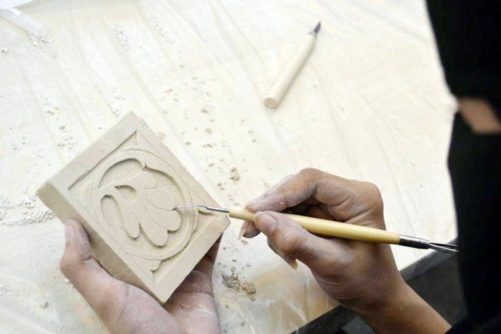 فنانة تبرز مهاراتها بطريقة النحت على الجبس.