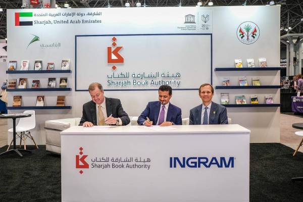 ووقع الاتفاقية رئيس هيئة الشارقة للكتاب أحمد بن ركاض العامري، والرئيس التنفيذي لمجموعة «إنغرام كونتنت» شون مورين، بحضور رئيس مجموعة «إنغرام كونتنت» جون إنغرام، وذلك في جناح الهيئة المشارك بمعرض «اكسبو أمريكا» المقام في مدينة نيويورك بالولايات المتحدة الأمريكية.