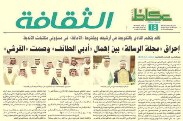في حين تبادل الناقد الدكتور عالي القرشي وأحد أعضاء مجلس إدارة النادي الأدبي في الطائف، التهم حول المسؤول عن إحراق «مجلة الرسالة» التي تشكل مصدرا ثقافيا مهما في أرشيف النادي، كشفت «عكاظ» مفاجأة من العيار الثقيل بعد أن قامت بجولة على مكتبة النادي ووجدت جميع أعداد مجلة الرسالة ضمن الوثائق والكتب التي يشتمل عليها أرشيف المكتبة ولم يتم إحراقها، وذلك يثبت أن مزاعم القرشي الذي أشار إلى إحراق مجلة الرسالة لم تكن مبنية على معلومات دقيقة، كما أن دفاع أحد أعضاء مجلس الإدارة أكد جهل ذلك العضو بمحتويات مكتبة النادي الذي يمثل أحد أعضاء مجلس إدارته، إذ أشار في رده على القرشي، الذي نشرته «عكاظ» أمس الأول (الإثنين) تحت اسم «مصدر مطلع»، إلى أن حادثة إحراق المجلة تمت عندما كان القرشي عضوا في مجلس الإدارة ولم يتكلم عن الحادثة في حينها. لكن جولة «عكاظ» في مكتبة النادي أثبتت أن القرشي وعضو مجلس النادي كانا يهرفان بما لا يعرفان، إذ تبادلا التهم حول حادثة لم تتم في الأصل.