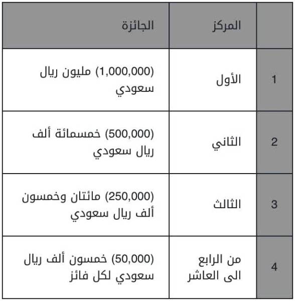 وحددت جائزة مليون ريال للفائز الأول، ونصف مليون للثاني، و250 ألفا للثالث و50 ألفا لكل فائز من المركز الرابع إلى العاشر. وبهذا يكون إجمالي الجائزة مليونين و100 ألف ريال.