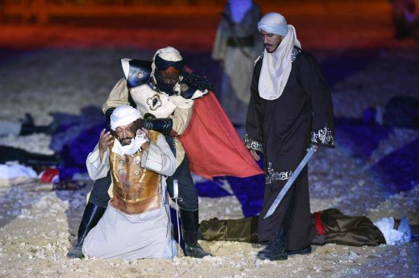 يشاهد زوار «سوق عكاظ» يوميا في جنبات الجادة، حركة القوافل العربية تحت أصداء قصائد الشعراء وحوافر الخيول وصليل السيوف والخناجر، في مشهد درامي تاريخي يستحضر ما كان عليه السوق قبل أكثر من 1400 عام، حيث يجلس النابغة الذبياني تحت قبة حمراء لتحكيم قصائد الشعراء وتحديد مراتبهم، فيما يصدح هناك عمرو بن كلثوم مع بني تغلب بشخصيته الصارمة ونظراته المحددة وسيفه في يده منشدا بصوت جهوري يسمعه من في السوق (إِذَا بَلَـغَ الفِطَـامَ لَنَا صَبِـيٌّ *** تَخِـرُّ لَهُ الجَبَـابِرُ سَاجِديْنَـا).