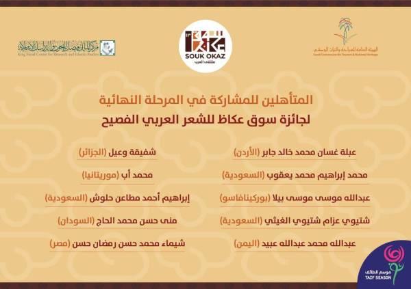أعلنت لجنة تحكيم جائزة شاعر سوق عكاظ تأهل 10 شعراء للمرحلة ما قبل النهائية، بينهم 3 سعوديين هم محمد يعقوب وشتيوي الغيثي وإبراهيم حلوش.