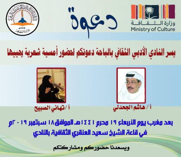 وتشاركه الأمسية الشاعرة تهاني الصبيح التي سبق أن شاركت في مهرجانات شعرية آخرها مهرجان الشارقة وصدرت لها مجموعة «فسائل».