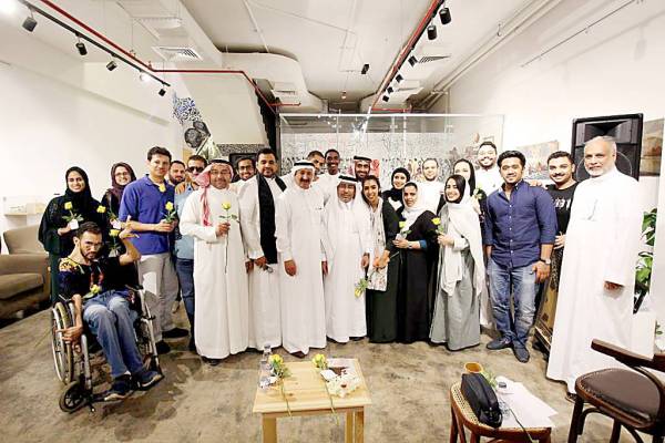 أحمد عائل فقيهي محاطا بأصدقائه الشعراء وأفراد أسرته بعد الأمسية.
