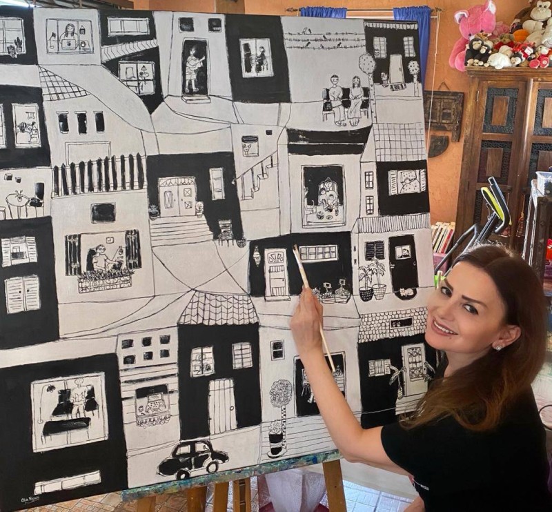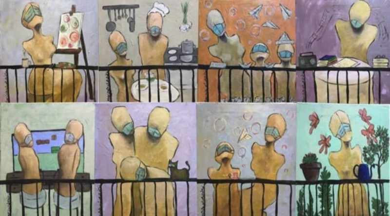 أما الفنانة فاطمة الدهماش فقدمت عملا بعنوان (جيران العمارة في زمن الكورونا). وقالت لـ«عكاظ»: «تكمن محاربتنا لفايروس كوفيد١٩، بالعزلة والجلوس في المنزل، وقد أتاحت لنا هذه الأزمة أن نكتشف جمال وهدوء العزلة وممارسة أمور لم نكن نستطيع ممارستها مع زحمة وانشغالات الحياة»، وتظهر اللوحة مجموعة من الجيران المتجاورين، وكل له اتجاهاته وممارساته الخاصة من ثقافة وترفيه.
