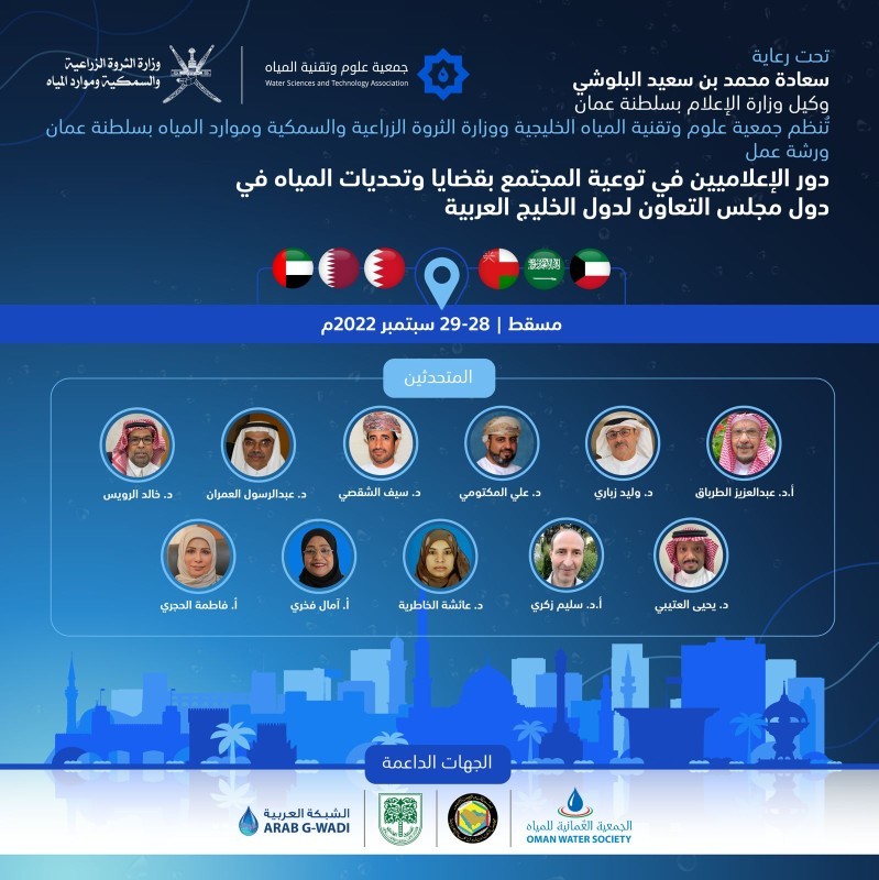 تستضيف العاصمة العمانية مسقط ورشة تدريبية تهدف إلى الارتقاء بدور الإعلاميين في توعية المجتمع بتحديات وقضايا المياه في دول مجلس التعاون لدول الخليج العربية، تقام في 28 و29 سبتمبر الجاري تحت رعاية وكيل وزارة الإعلام العماني محمد بن سعيد بن محمد البلوشي، بتنظيم جمعية علوم وتقنية المياه الخليجية ووزارة الثروة الزراعية والسمكية وموارد المياه العمانية والشبكة العربية للمياه والتنمية للمناطق الجافة G-WADI Arab والجمعية العمانية للمياه.