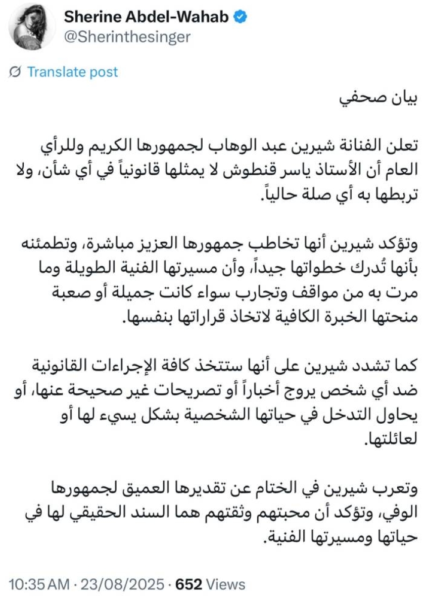 Sherine Abdel Wahab issued a press statement via her personal account on the "X" platform, which stated: "The artist Sherine Abdel Wahab announces to her dear audience and the public that Mr. Yasser Qantosh does not represent her legally in any matter, and she has no connection with him currently."