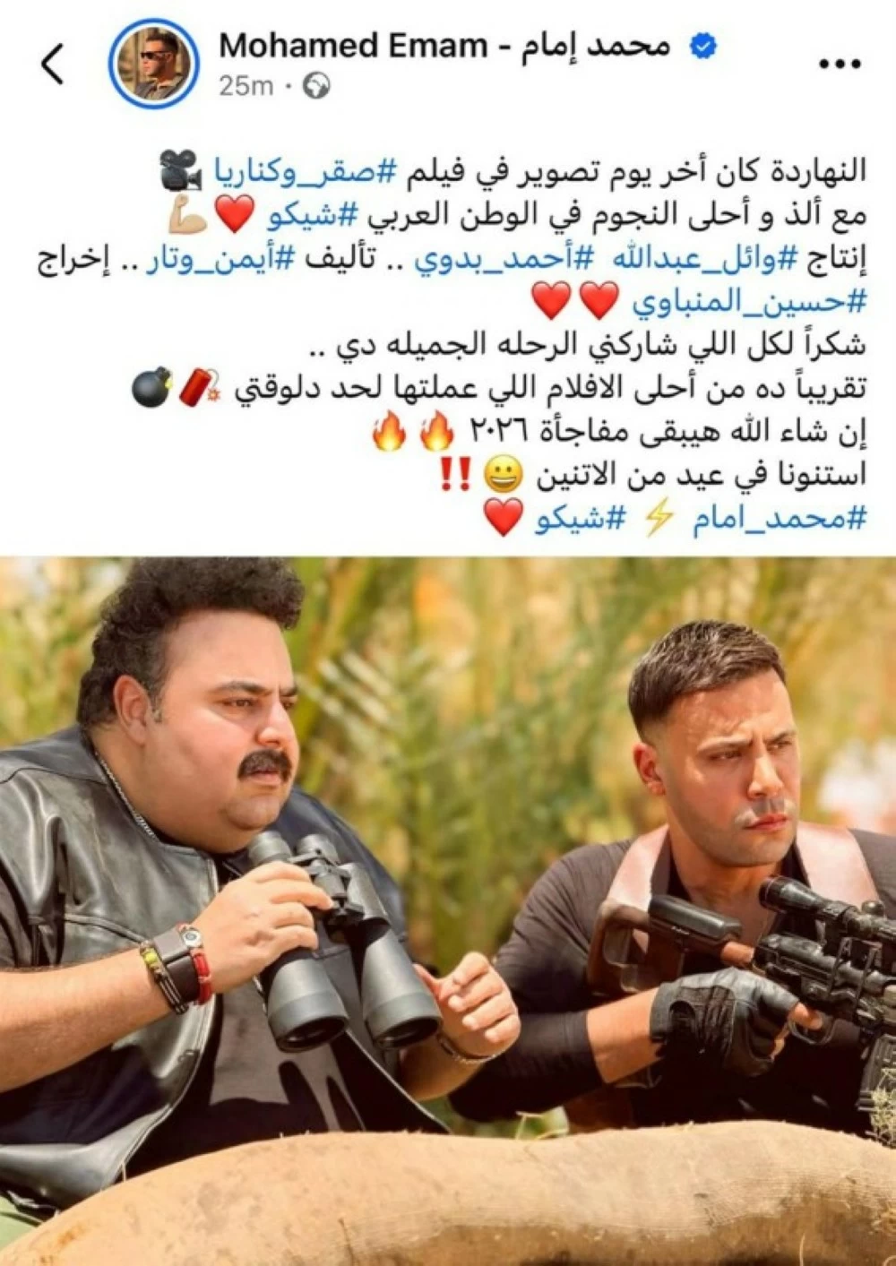 وعبر إمام، في منشور عبر حسابه الشخصي على منصة «فيسبوك»، عن امتنانه لفريق العمل كاملاً، مؤكداً سعادته بالتجربة، موجهاً رسالة تقدير لكل من شاركه هذه الرحلة الفنية، مشيراً إلى أن كواليس الفيلم اتسمت بروح مميزة جمعت نخبة من نجوم الوطن العربي.
