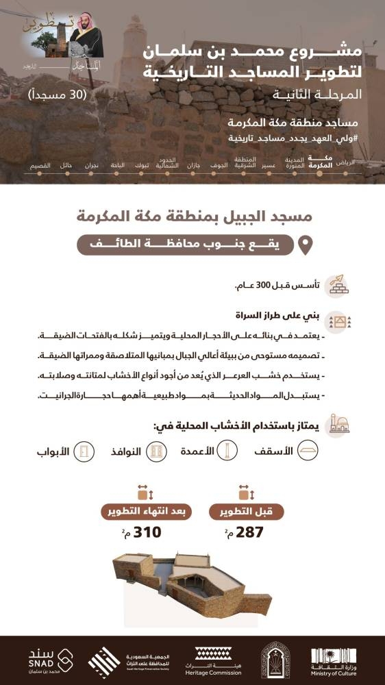 يشتهر مسجد الجبيل الذي يقع في مركز ثقيف جنوب محافظة الطائف بمنطقة مكة المكرمة، بأحجاره التي بنيت على طراز السراة العمراني قبل 3 قرون، ما جعله ينضم لمساجد المرحلة الثانية لمشروع الأمير محمد بن سلمان لتطوير المساجد التاريخية، ليعيد المشروع لهذا المسجد تقاليده العمرانية القديمة، ويعزز الوعي العام للعناية بالمساجد التاريخية وأهمية الحفاظ عليها مع تقدم الزمن.
