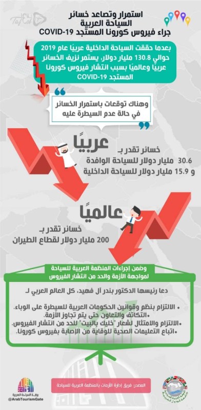وأكد أن الخسائر في العالم العربي قد تصل إلى نحو 30.6 مليار دولار في حالة عدم السيطرة على الوباء حتى نهاية شهر أبريل القادم، وأن الخسائر لم تتوقف فقط على مردود الدخل للسياحة الوافدة، بل امتدت آثارها أيضا إلى مردود الإنفاق على السياحة الداخلية عربيا التي حققت بنهاية عام 2019 دخلا بحدود 130.8 مليار دولار، ونتيجة لتوقف كافة الأنشطة والفعاليات السياحية جراء فايروس كورونا المستجد نتج عن ذلك خسائر قد تصل إلى أكثر من 90% بمايعادل 15.9 مليار دولار حتى نهاية أبريل القادم.