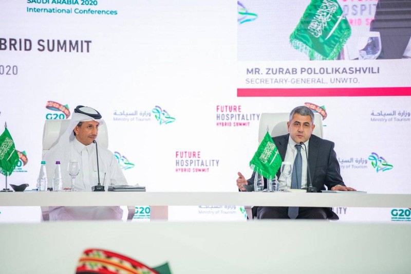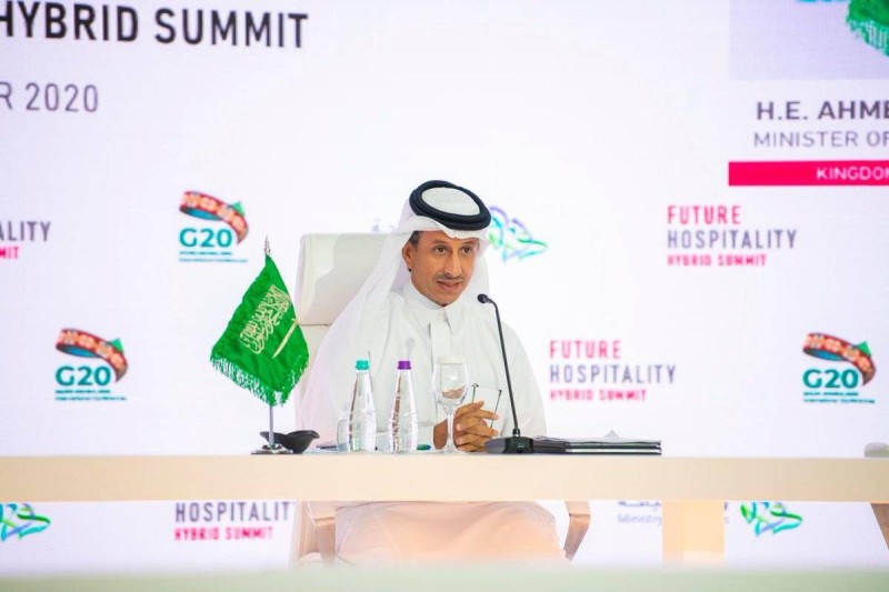 وألقى وزير السياحة كلمة في بداية المؤتمر استعرض من خلالها الجهود التي بذلتها المملكة مع مجموعة العشرين من أجل الحد من تداعيات جائحة كورونا على العالم وتسريع إجراءات تعافي القطاع السياحي باعتبار أن السياحة تمثل المصدر الأهم للدخل في العالم، وقد تضرر من الجائحة منذ بداية العام الحالي نحو 100 مليون وظيفة وهذا الأمر استدعى تنسيقا عالي المستوى مع دول مجموعة العشرين والشركات الكبرى العاملة في القطاع من أجل وضع الحلول لاستعادة تلك الوظائف من خلال السفر السلس والإجراءات الصحية التي تضمن تعافي القطاع مع الحفاظ على صحة السياح والعاملين في القطاع.