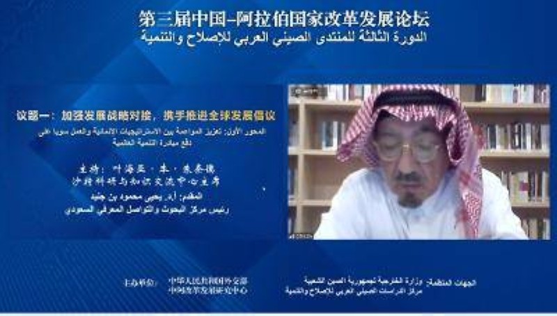 ركز المنتدى الصيني العربي للإصلاح والتنمية على مضامين مبادرة التنمية العالمية، وتناول المحور الأول للمنتدى تعزيز الموائمة بين الاستراتيجيات الإنمائية والعمل سوياً على دفع مبادرة التنمية العالمية، الذي قدمه رئيس مركز البحوث والتواصل المعرفي السعودي الدكتور يحيى بن جنيد.