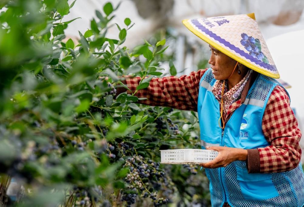 The Nge County is located in the Nujiang Lisu Autonomous Prefecture in the northwest of Yunnan Province, China. Thanks to its resources and climatic advantages, the region has successfully developed a large-scale late-maturing blueberry industry in the highlands. In the picture, a worker is picking berries in the county. (Chinese Economy Daily).
