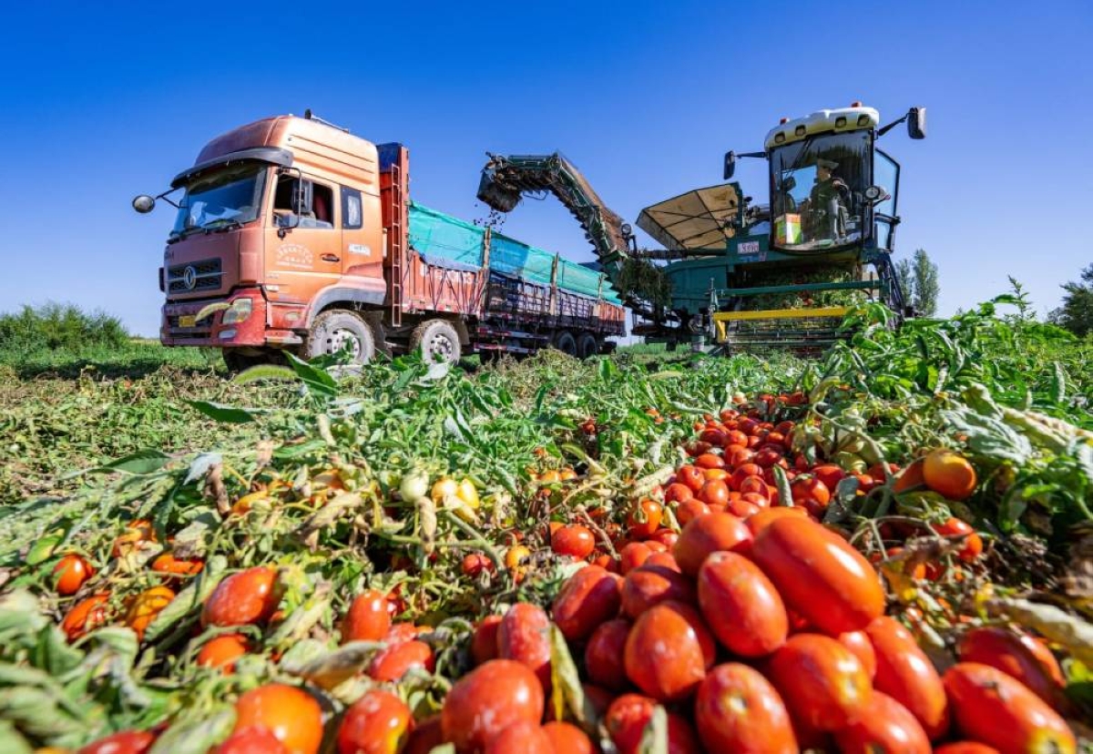The Hotobi County, part of the Changji Hui Autonomous Prefecture in the Xinjiang region of China, has gradually entered the tomato harvest phase, having harvested 21,600 tons of tomatoes. In the picture, agricultural machinery is seen harvesting quantities of tomatoes in one of the county's fields. (Chinese Economy Daily)