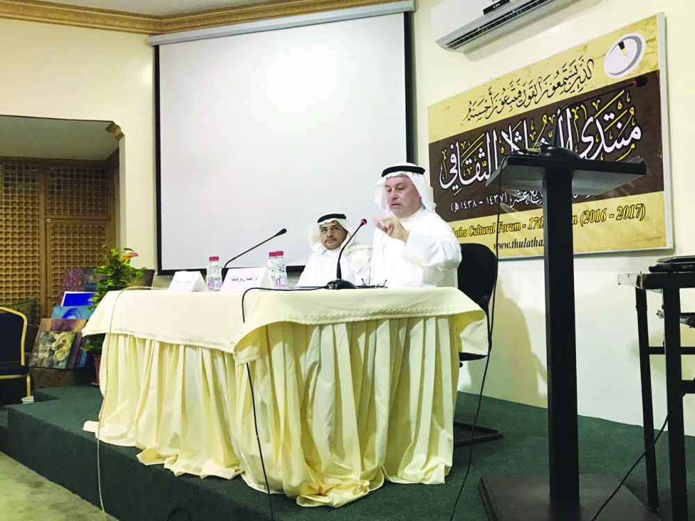 إحسان بوحليقة خلال مشاركته في الندوة. (عكاظ)