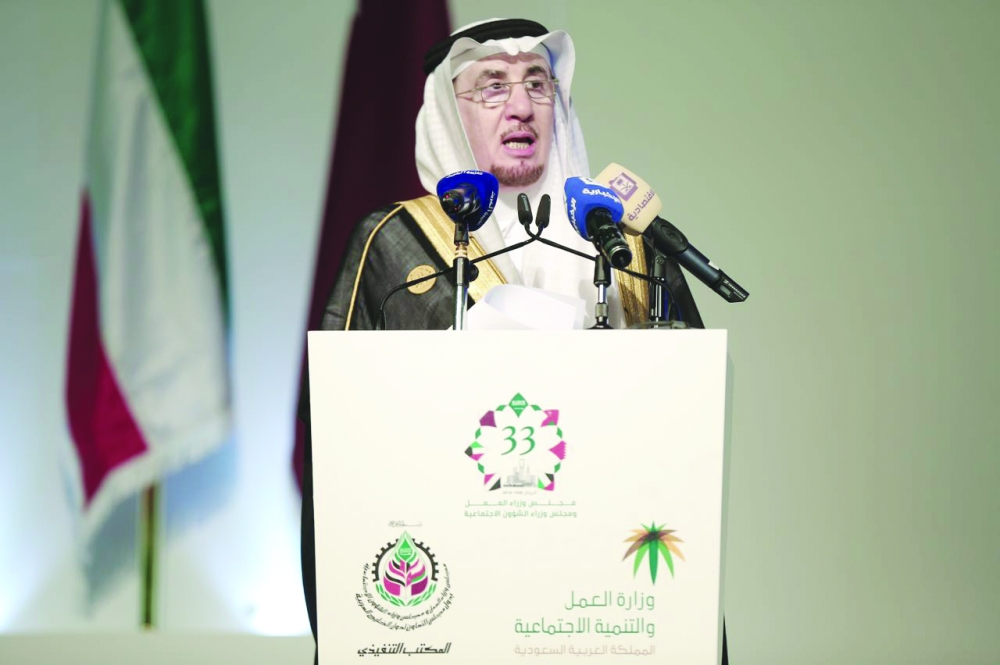 وزير العمل مفرج الحقباني يلقي كلمته لوزراء العمل والتنمية الاجتماعية. (عكاظ)