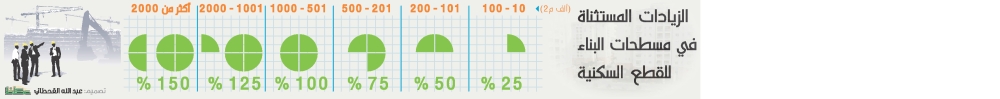 أنهت وزارة الإسكان تحديد إجراءاتها الخاصة بتفعيل الأمر السامي القاضي باستثناء المشاريع المتصلة بالإسكان من اشتراطات البناء المتعلقة بتعدد الأدوار، والارتدادات، والمساحات، كذلك الخدمات العامة، تلبية لحاجات المستفيدين دون الإخلال بمتطلبات الأمن والسلامة في تلك المشاريع، إذ قسمت الاستثناءات على ست فئات بحسب مساحات الأراضي، بداية بالفئة التي تبدأ من عشرة آلاف متر مربع وحتى مائة ألف متر مربع بزيادة لا تتجاوز 25% وتصل إلى أعلى فئة للمساحات التي تبدأ من مليوني متر بزيادة تصل إلى 150%.